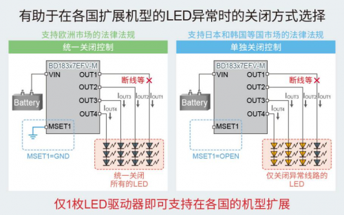 新产品配备了LED单独控制功能,因此仅1枚IC即可驱动规格不同的2个LED灯,IC数量的减少有助于大幅削减电路板面积。