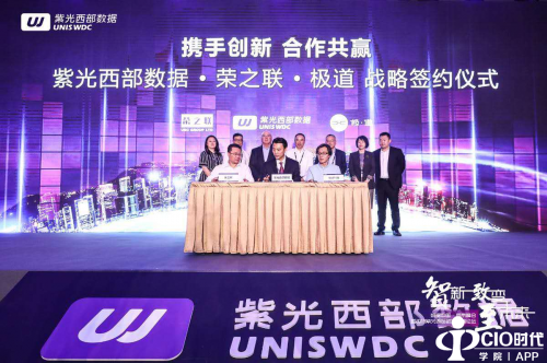 在荣之联董事长王东辉、荣之联副总裁齐晓枫、荣之联华东华中大区总经理江成聪、紫光股份总裁王竑弢、西部数据高级副总裁PhilBullinger、紫光西部数据董事长章雷、紫光西部数据首席运营官王笑丹等领导的见证下,荣之联CEO闫国荣、极道CEO吴江和紫光西部数据CEO缪刚作为代表在协议上签字。