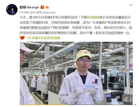 赵明表示:“我不得不道歉,虽然在短短的28天我们已经生产和即将发货100万台荣耀9,但是还是挡不住我们用户和花粉朋友们的热情。非常感谢生产线上的各位小伙伴们,我们也会更加的努力,把更多的荣耀9带给大家。”