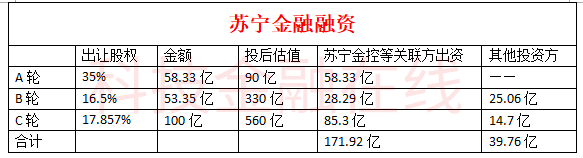 2016年10月,苏宁金融完成第一轮融资,苏宁金控以58.33 亿元,取得35%股份。苏宁易购的股权从100%下降到65%,苏宁金融投后估值达到90亿。