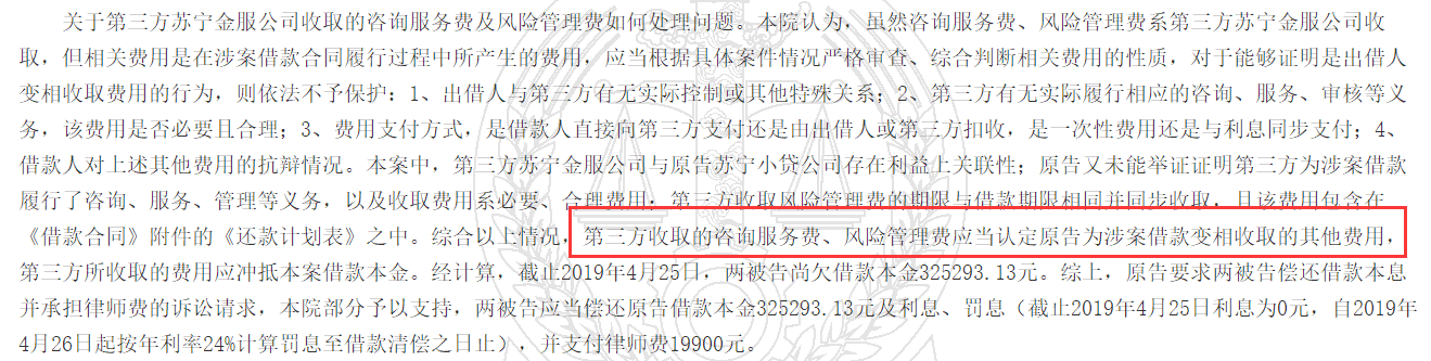 今年1月14日,中国裁判文书网上披露的重庆苏宁小贷公司与刘某和杨某的金融借款合同纠纷一审判决书显示,在向刘某和杨某发放贷款过程中,上海苏宁金融服务集团有限公司(也就是苏宁金融)作为第三方收取了刘某咨询服务费13500元、并向了刘某收取风险管理费共计7290元(810元/月×9个月)。法院最终判决认为,第三方苏宁金融与苏宁小贷公司存在利益上关联性,苏宁小贷又未能举证证明苏宁金融为刘某等借款人履行了咨询、服务、管理等义务,以及收取费用的合理性。因此法院认为苏宁金融收取的咨询服务费、风险管理费应当认定为变相收取的其他费用,这些费用应冲抵借款本金。