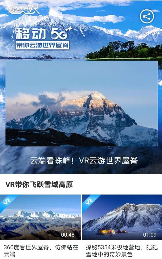 与此同时,用户还可以通过佩戴VR头显设备(一体式或分体式VR眼镜)进入“移动云VR”,足不出户畅享VR全景看珠峰的极致体验:时而遥望最纯净的蓝天、时而俯瞰广袤的大地,时而感受最冷冽的寒风,即使远隔千里之外,也能轻松“登上”珠穆朗玛峰,让一切“浸”在眼前。