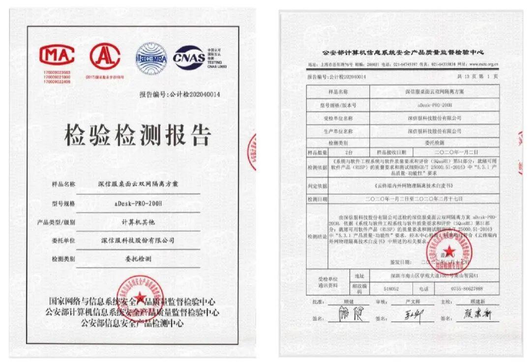 为了进一步打消用户对于双网隔离方案在物理隔离安全合规性的以上疑虑,深信服积极与公安部第三研究所检测中心信息安全产品检测中心开展对桌面云双网隔离合规性的权威检测并顺利获得检验检测报告,物理隔离安全合规性受到权威机构认可。