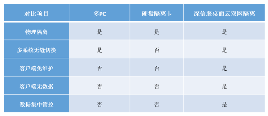 ▲方案对比:深信服双网隔离、传统多PC隔离、硬盘隔离卡隔离