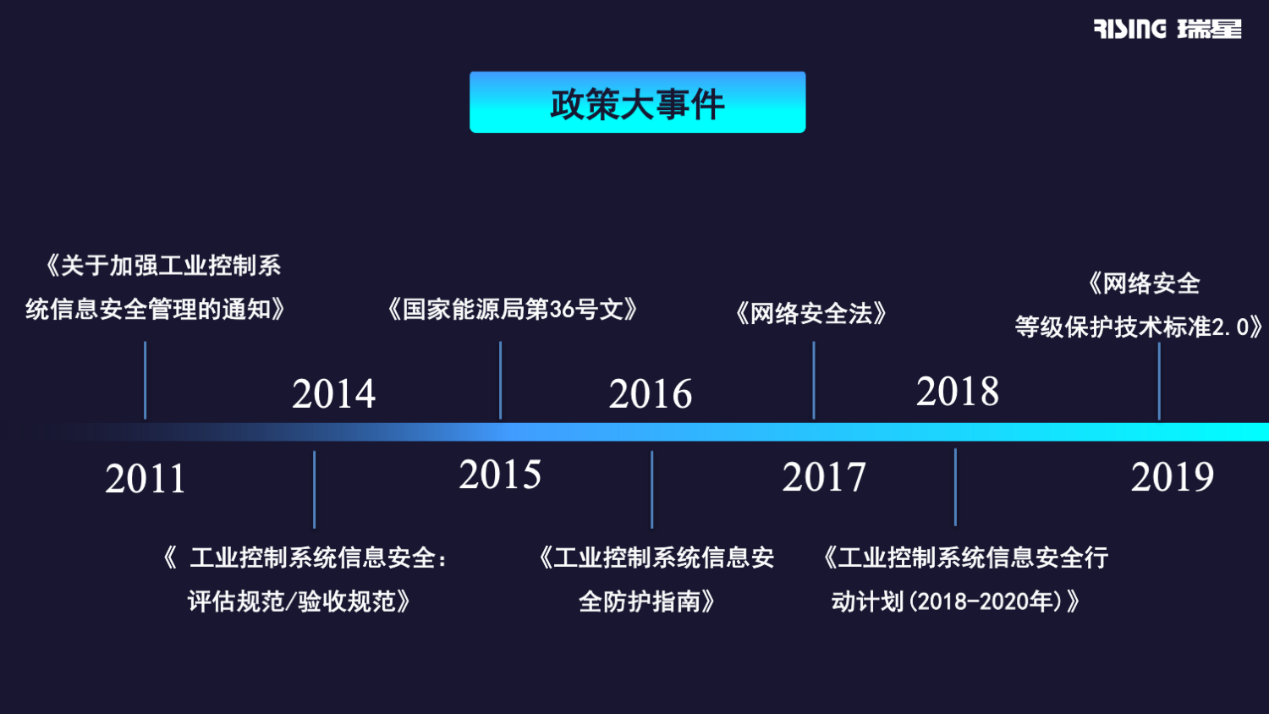 在这样的大环境下,我国为提升工业企业工业控制系统信息安全防护能力,促进工业信息安全产业发展,由工业和信息化部印发了《工业控制系统信息安全行动计划(2018—2020年)》。这为工业互联网安全保障工作制定了时间表和路线图,明确了相关部门及企业的发展方向,为更好的开展工控安全工作提供了依据和指导意见。