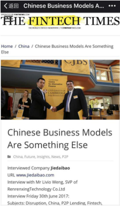 在报道中,The Fintech Times介绍到“借贷宝是中国最大的金融科技平台之一,同时它还是一个具有社交属性的借贷平台,可以让用户根据自己的社交网络进行借贷。”