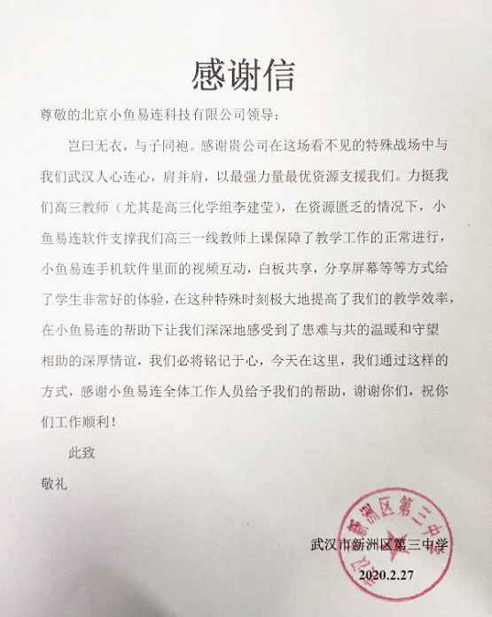 温暖不仅如此,武汉市新洲区第三中学寄来了感谢信,对疫情期间小鱼易连的支持表示感谢,信中还提到设备支撑了教学工作的正常进行,在特殊时期极大提高了教学效率。四川省教育厅也将小鱼易连列为停课不停学推荐品牌。在这场特殊的战“疫”中,多地教师借助小鱼易连让数百万高三、初三学子“重返课堂”,帮助他们抢回宝贵的学习时间,将疫情影响降到最低。