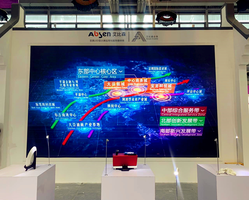艾比森携P2.9mm产品在龙岗展位打造了一块融合龙岗特色建筑的视频墙,位居整个展位的中心位置,以生动图像和视频展示龙岗区文化创意产业的发展历程和成果。高亮、高清晰、超细腻的画质吸引了每一位从龙岗展位正门而入的观众的眼球。