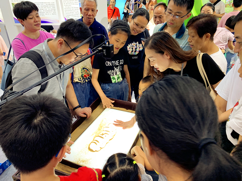 不仅如此,艾比森LED显示屏也为观展者带来了极具乐趣的沙画互动体验。现场专业的沙画表演者以及参与沙画尝试的观众,都能在超大LED显示屏上实时观看自己的创作过程和创作成果。这一前所未有的极致体验吸引了不少观众争相体验,也为主会场龙岗展区带来了更多人气。