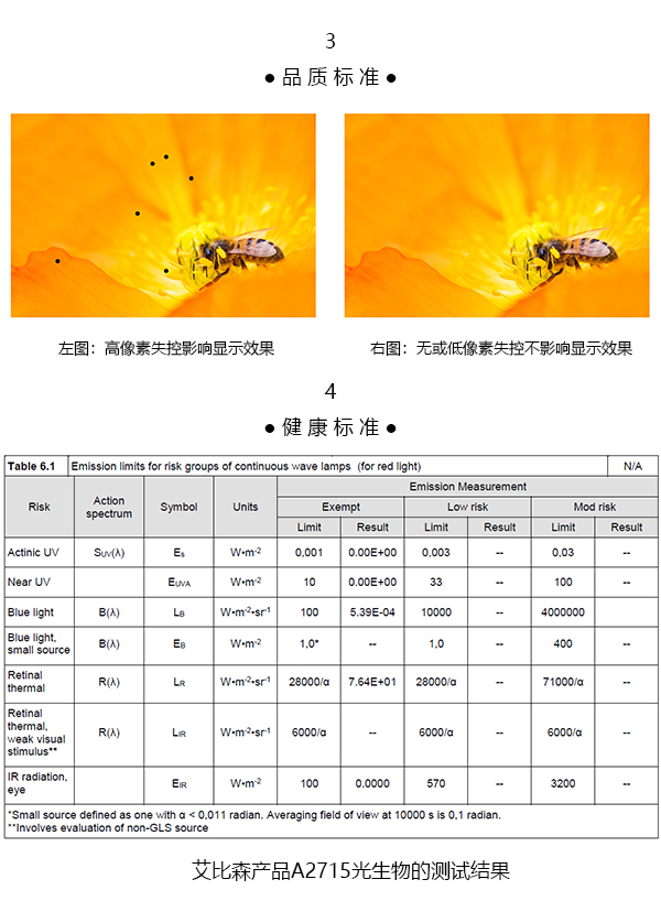 而在近年来人们格外关注的健康指标上,艾比森同样做出了严格的规定。例如在蓝光辐射指标上,艾比森A2715实测最高值仅3.42W•m-2•sr-1,远远低于行业100 W•m-2•sr-1的完全豁免最低标准,进而可以有效减少长时间观看LED大屏对人眼视力健康的损害,同时有效提升LED屏的观看舒适度,进而使得LED屏应用领域拓宽成为可能。