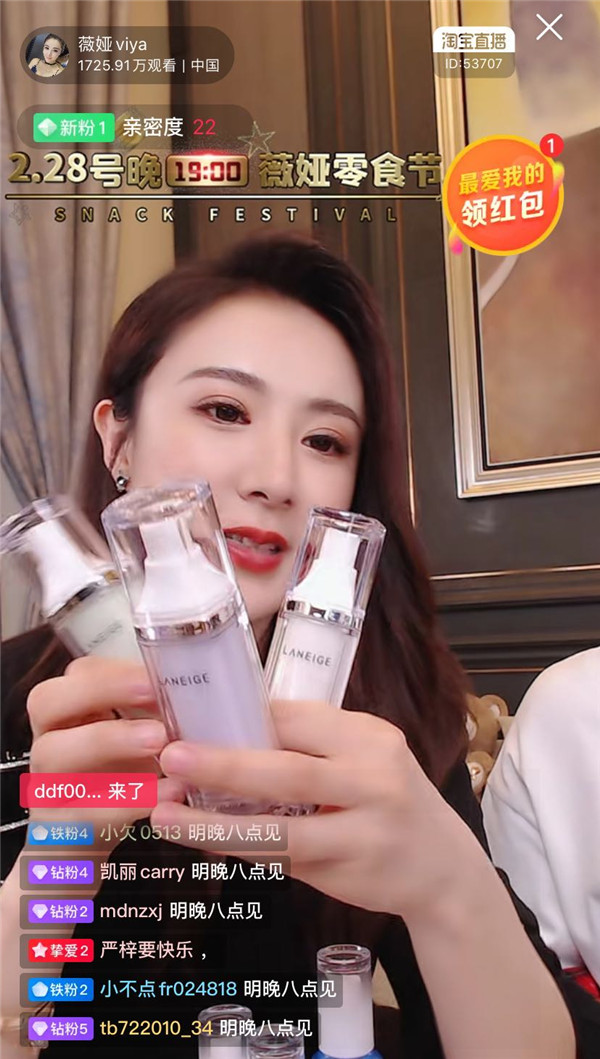 同时,在粉丝经济高度扩张的今天,兰芝X天猫超级品牌日特邀直播一姐薇娅与新生代小花旦杨紫打造直播热点,站内百场KOL直播+店铺日播,为消费者带去优质产品讲解的同时,也增强品牌与消费者之间的互动,真正将粉丝的力量有效转化,为兰芝在产品、粉丝与流量之间形成良性闭环。据悉,在2月26日的薇娅直播间兰芝专场,累计关注人次达1727万+人。