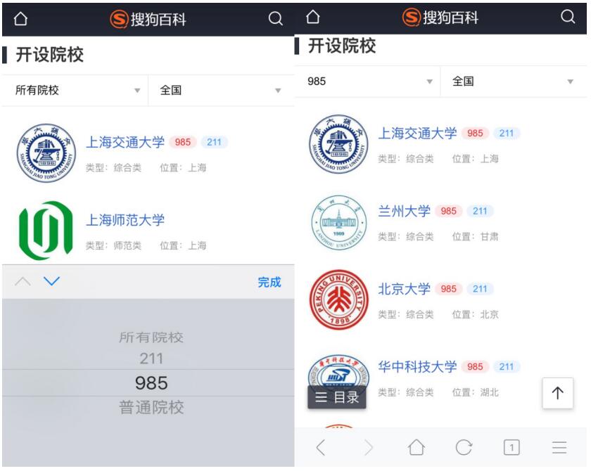 值得一提的是,搜狗百科专业类词条中“开设院校”模块罗列的所有院校,均支持用户按照院校等级、地域两个维度进行筛选查看。也就是说,用户可以通过选择“985”“211”等院校等级,或“北京”“上海”某座城市,即可定向了解选择范围内开设该专业的院校有哪些,方便学生综合自身成绩及意愿筛选、了解该专业中可报考的院校。譬如,学生在了解“生物技术”时,想知道全国开设该专业的985高校有哪些,同时选择“985”及“全国”即可得知结果。