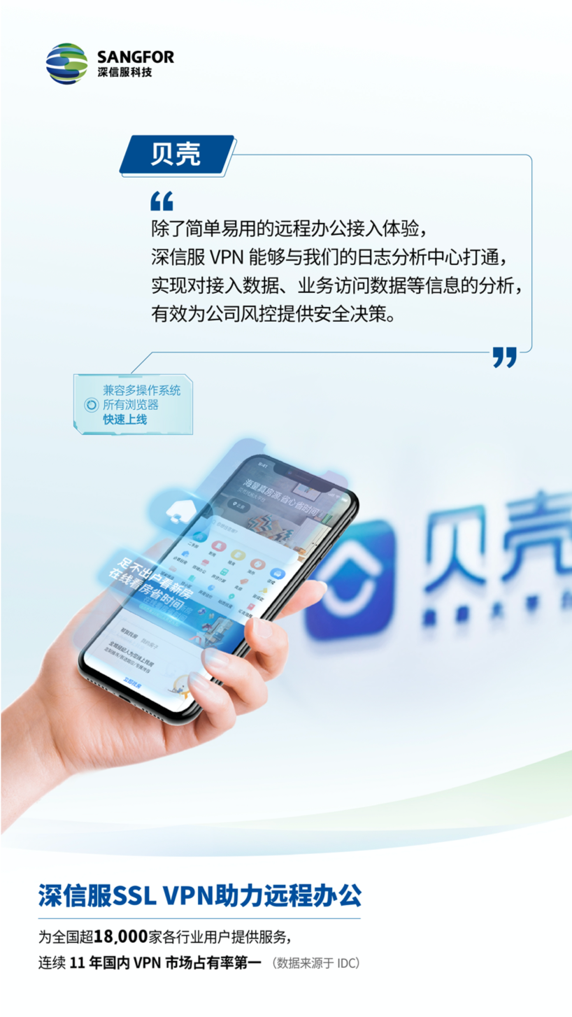 在远程办公接入方面,贝壳找房选择相信深信服***。一方面,源于深信服***简单易用的特性,给贝壳找房的员工提供了良好的远程接入体验;另一方面,深信服***能够与其自建的日志分析中心对接,使得贝壳找房能够有效地对远程办公接入数据、业务访问数据等远程办公信息进行分析,从而辅助公司的风险管控决策。