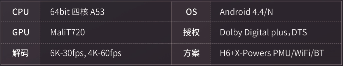 全志科技H6芯片采用ARM 四核A53 CPU,搭配MaliT720 GPU,支持OpenGL3.1,支持DDR4、EMMC5.0,芯片性能比上一代提高77%;解码支持4K@60fps,最高分辨率可达6K(5780×2890);支持 HDR10、HLG,并集成Allwinner Smartcolor3.0智能画质引擎;另外,H6还提供了多种高速接口,包括USB 3.0,PCIe 2.0,千兆网口等,传输更快,信号更强。