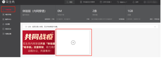 在花生壳Web管理后台的“内网穿透”板块,点击“+”添加映射;