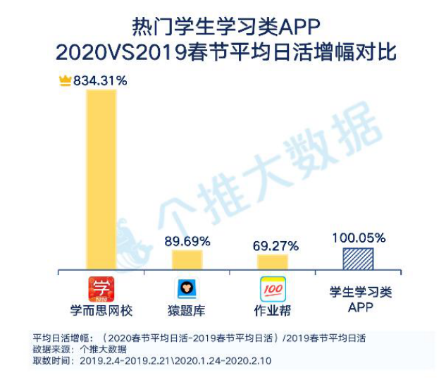 个推大数据显示,与2019年的春节期间相比,今年春节学生学习类APP的平均日活增幅和新增用户增幅分别为100.05%和238.79%,都呈现大幅度增长。学而思表现出色,平均日活同比增幅和新增用户同比增幅分别为834.31%和2422.66%