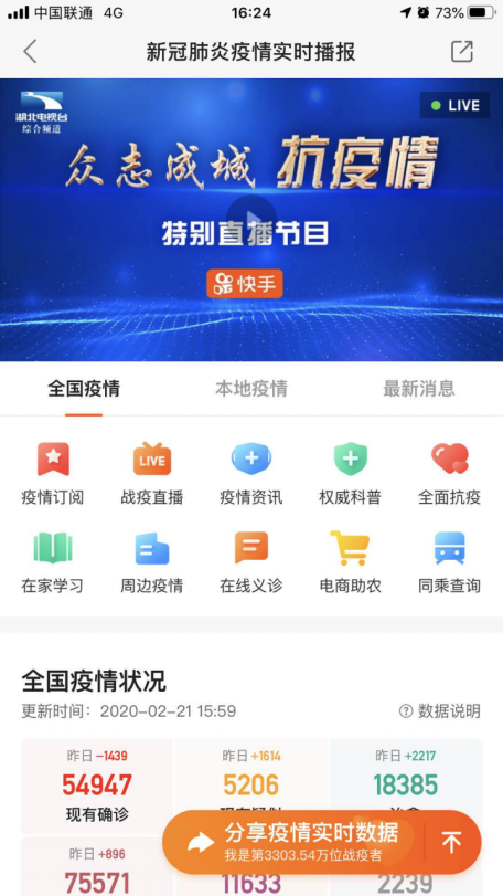 根据快手大数据研究院发布的报告显示: 2020 年 1 月 20 日至 1 月 31 日期间,快手肺炎防治频道点击量突破 30 亿次;疫情直播累计超过 10 亿人次观看;政务号发布的内容播放总量高达 250 亿次,影响力可见一斑。