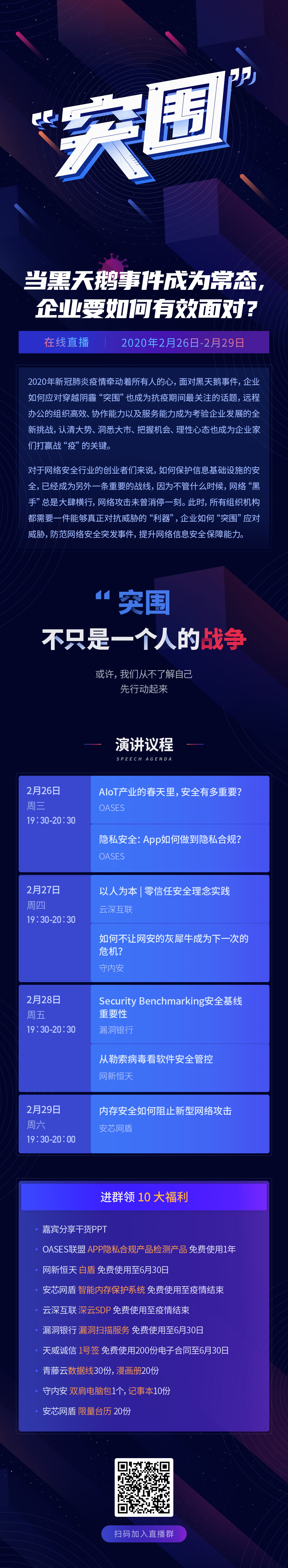 “突围”聚集7位深耕于信息安全技术一线专家,从“似解燃眉之急,却非长远之策“的远程办公、内存安全、APP隐私合规、AIoT产业安全、安全基线等话题出发答疑解惑,活动将在本周的2月26日-29日连续4天晚上19:30为大家带了一场关于网络安全的在线晚宴。此次直播不仅可以了解先进的技术和解决方案,还可以线上互动,进直播社群即可享OASES联盟 APP隐私合规产品检测产品、安芯网盾 智能内存保护系统、云深互联 深云SDP、漏洞银行 漏洞扫描服务、网新恒天 白盾、天威诚信1号签电子合同等6大产品免费使用权限和嘉宾PPT,还有现金红包、双肩电脑包、数据线、记事本、台历等多样礼品等你拿,欢迎大家的踊跃参加。