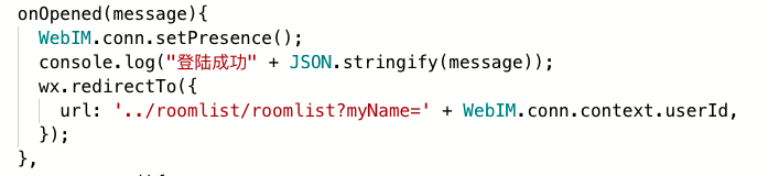 在app.js 中注册的 WebIM.conn.listen, 然后在 登陆成功的回调 onOpened 设置的跳转页面,并将登陆的 username 赋给 myName,传到新的页面中使用