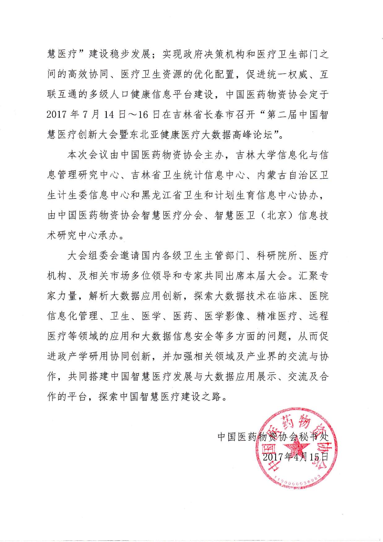 为深入贯彻落实《“健康中国2030”规划纲要》和《关于促进和规范健康医疗大数据应用发展的指导意见》(国办发〔2016〕47号)文件精神,构建完善人口健康服务体系,实现国家省市县四级人口信息平台互通共享,远程医疗覆盖省市县乡四级医疗卫生机构;大力推动互联网医疗新兴业态发展,发展远程医疗和智慧医疗,促进云计算、大数据、物联网、移动互联网等信息技术与健康服务的深度融合。加强建立和完善全国健康医疗大数据资源体系,深化健康医疗大数据行业治理、临床和科研、公共卫生、教育培训等领域的应用,推进大数据内容安全、数据安全及技术安全等一系列健康信息化基础的逐步完善,实现“智慧医疗”建设稳步发展;实现政府决策机构和医疗卫生部门之间的高效协同、医疗卫生资源的优化配置,促进统一权威、互联互通的多级人口健康信息平台建设,中国医药物资协会定于2017年7月14日~16日在吉林省长春市召开“第二届中国智慧医疗创新大会暨东北亚健康医疗大数据高峰论坛”。