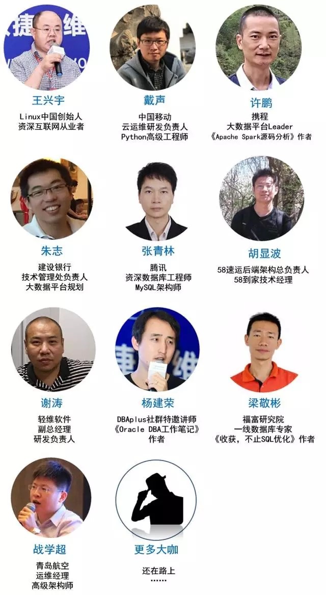 经过组委会热火朝天的筹备,目前确定出席的嘉宾有来自Linux中国、中国移动、携程、建设银行、腾讯、58到家、轻维软件、青岛航空等名企大咖,还有《收获,不止SQL优化》作者梁敬彬老师和《Oracle DBA工作笔记》作者杨建荣老师,群英汇聚,人才济济,只等你前来探秘大神解决问题的脑回路,带来跳出舒适区的新启发。