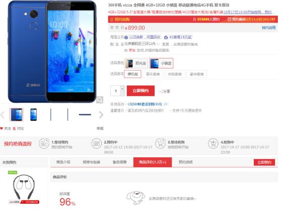 10月12日,360手机vizza小镇蓝版开启预约,并将于17日在京东首销。