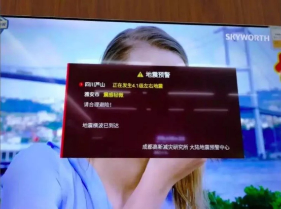 雅安、成都等地开通了广电电视地震预警的区域,均收到了电视地震预警提示,创维电视就是首批收到预警的电视终端之一。据悉,达到烈度阈值的终端都有发出地震预警警报或提示,没有达到烈度阈值的终端按要求不发出地震预警。