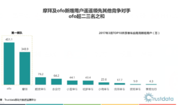 据Trustdata《2017年Q1中国共享单车行业用户监测报告》提供的数据来看,ofo3月份用户量为451.1万,超过了摩拜的348.9万。而报告还指出了,ofo新增用户超过了二三名(摩拜和酷骑)之和。