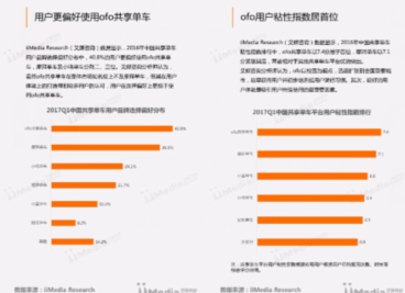 用户偏好和粘性意味着用户的谁家用户存留比例和使用率高,所以再来看看关于还这两方面的数据。据艾媒发布的《2017Q1中国共享单车市场研究报告》显示,2016年中国共享单车用户品牌选择偏好分布中,40.8%的用户更偏好使用ofo共享单车,摩拜为36.5%。而在粘性指数排行榜中,ofo以7.4分居于首位,摩拜为7.1分。两项数据相比,虽然相差不多,但客观来讲摩拜依然略逊一筹。