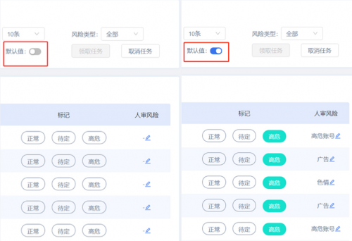 默认机审与人工标记:设置默认值开关,默认开启,标注机审的识别结果,便于审核员参考。手动关闭,审核员须人工审核每条数据,防止漏审、错审。
