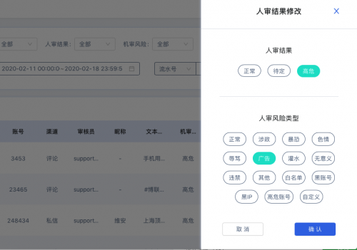 人审结果多样化处置:人审完成的数据进入审核结果界面,支持条件筛选搜索,可进行复审和质检,人审结果与风险类型支持修改,也可针对相关账号采取违规处置,对误杀漏杀进行反馈。