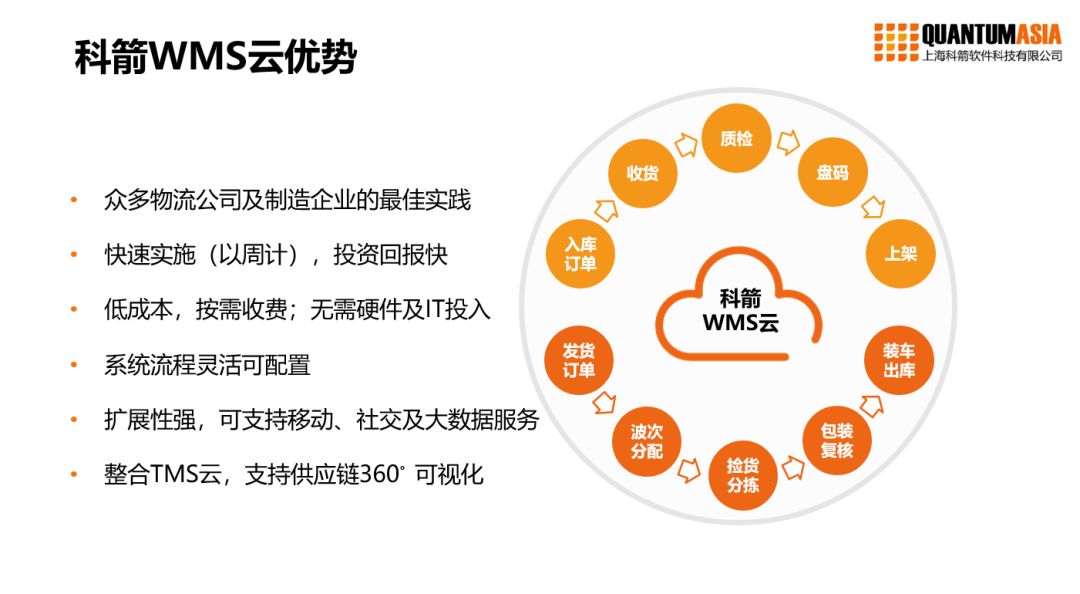 科箭在供应链领域拥有十多年的经验,是国内最早转型云端的供应链软件公司。WMS云是基于行业沉淀设计的专业SaaS仓储管理产品。针对制造、零售、物流及电商等行业,WMS云流程可配置,场景化设计,投资回报快。