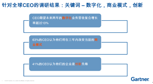 此外,Gartner针对全球CEO的调研结果显示,CEO对敏捷及商业模式的改变也有着自己的期望。