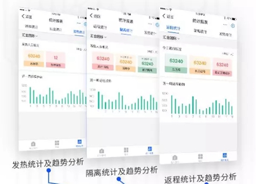 在社区防疫服务方面,社区服务人员可远程查看社区居民返程信息、社区居民发热信息、社区隔离人员名单等防疫重点信息(系统提供了相关的统计图表),根据这些信息,社区服务人员可对疫情进行快速研判,并制定合理的应对措施,使防疫工作更加有条不紊地开展。与此同时,社区服务人员还可借助钉钉与小区物业进行高效沟通,并且对防疫文件中的精神进行精准高效的上传下达。