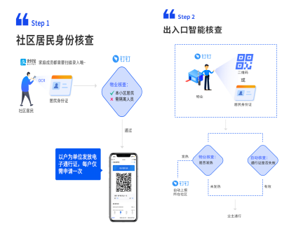 在社区出入口管理方面,目前许多社区都采用了分发出入证的管理形式。借鉴这一形式,朗新云筑在推出的“社区防疫通”产品中加入了“电子通行凭证”——社区居民在支付宝端填写出入申请后,物业根据相关政策对出入信息进行核查后,居民在支付宝端将收到“电子通行凭证”,出入社区时只需让物业用钉钉扫描“电子通行凭证”即可快速通行。