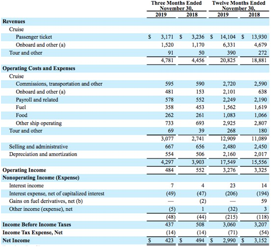 分析了下嘉年华邮轮的财报,发现,嘉年华邮轮的收入中67%来自船票,比如餐厅、舞厅、游泳池这类公共设施;32%来自其他收入,包含赌场,酒吧,温泉按摩等。也就是说,嘉年华邮轮99%的收入都来自于轮船上,一旦载客量减少,或者人均消费下降,收入必将受影响,这就是它连续下跌的原因。