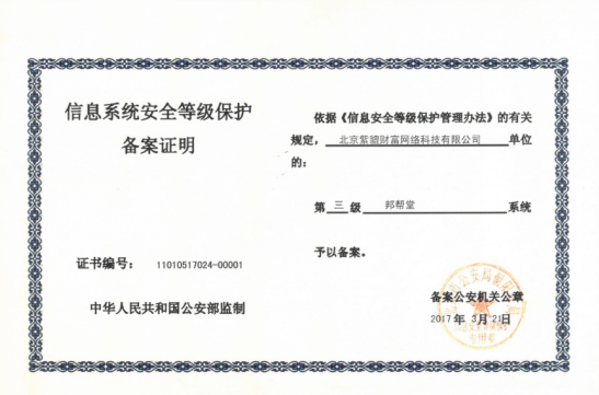 2017年3月21日,邦帮堂获得由公安部核准颁发的“国家信息系统安全等级保护三级备案”证明,这意味着邦帮堂已具备了完善的网络信息安全保护体系,并在技术安全、系统管理、应急保障等方面都达到了国家规定的相关标准。