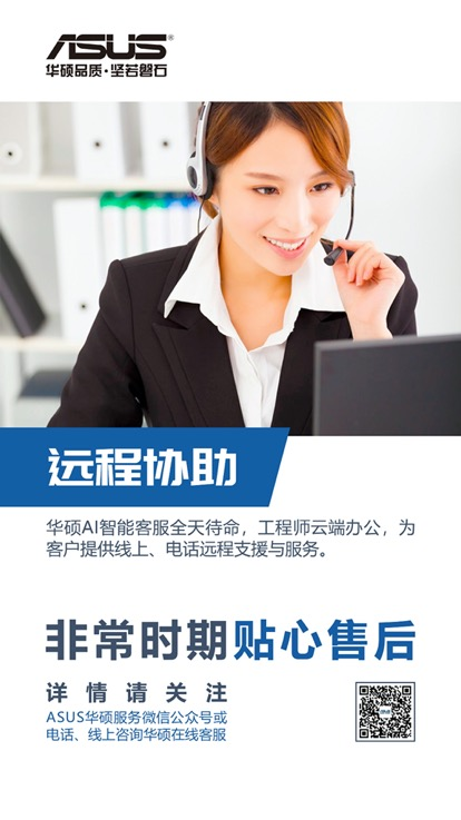 为防止疫情扩散,华硕诚挚建议您选择自助及在线服务。为第一时间协助您解决问题,华硕在线客服人员春节期间义无反顾地坚守工作岗位,为大家提供最有效的服务支持。华硕AI智能客服全天待命,同时工程师云端办公,不论身处何方,为客户提供线上、电话远程支援与服务,确保您“足不出户”即可解决问题。