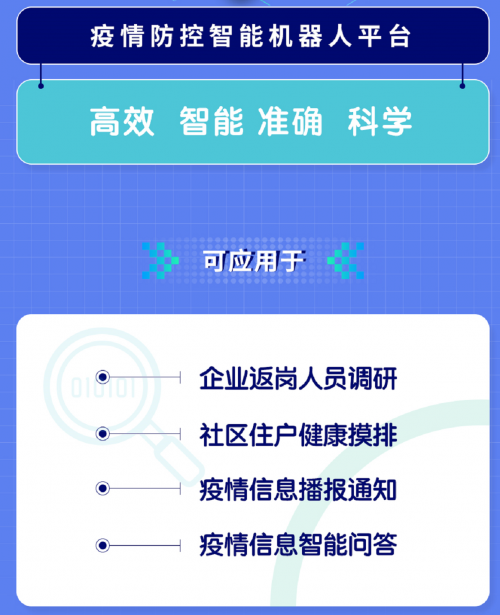 容联云通讯AI智能机器人疫情防控智能平台为奋斗在一线的政府机构、公益组织、社区居委会、医疗机构等免费提供价值过百万的疫情智能防控产品,可应用于疫情信息播报通知、疫情信息智能回答、社区住户健康摸排、企业返岗人员调研等。