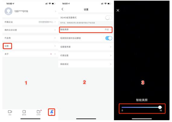 操作步骤:打开小鱼易连APP,点击主页面下方「我」按钮,找到「设置」选项,选择「智能美颜」,开启,根据个人需求调节美颜等级,0-16级美颜效果可供选择。