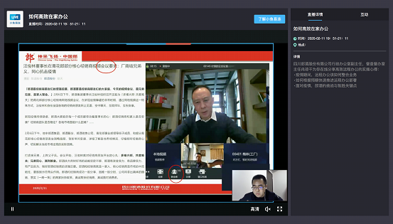 疫情期间,郎酒集团董事长汪俊林通过小鱼易连视频会议系统,实时向公司全体员工、广大经销商传达了“正心正德”酿好酒、扶大商、扶好商的精神,表达了厂商携手“共度难关”的决心,彰显出郎酒危难时刻的责任与担当。在家不停业,集团带头人董事长汪俊林一马当先,上周通过视频会议部署工作累计在线14个小时。