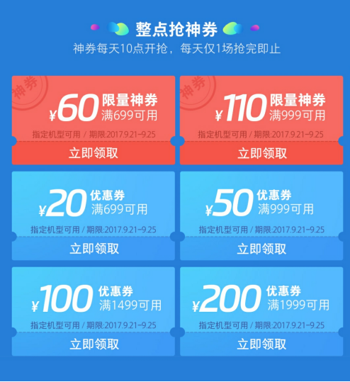 从现在开始,每天上午10点魅族都会放出优惠“神券”,其中包含了满699减60,满999减110的限量神券,可用于9月21日-9月25日购买手机抵扣,可谓是疯狂至极。