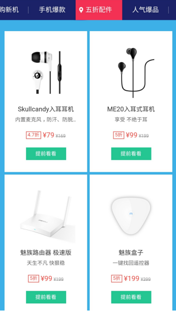 从活动页面来看,Skullcandy耳机、ME20入耳式耳机、魅族路由器、魅族盒子、EP-31耳机、等精品配件都有较大的优惠幅度,优惠价5折保底,最低可以打4.7折发售,非常诱人。