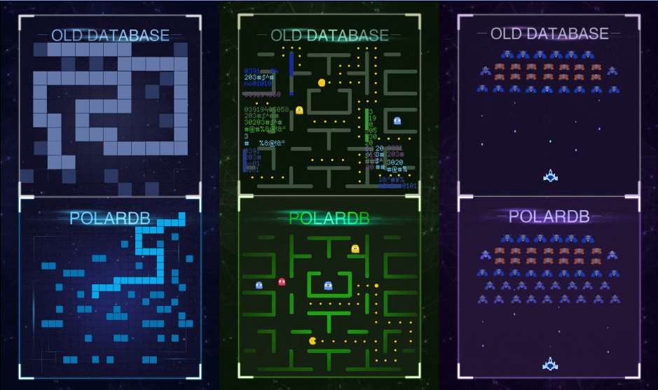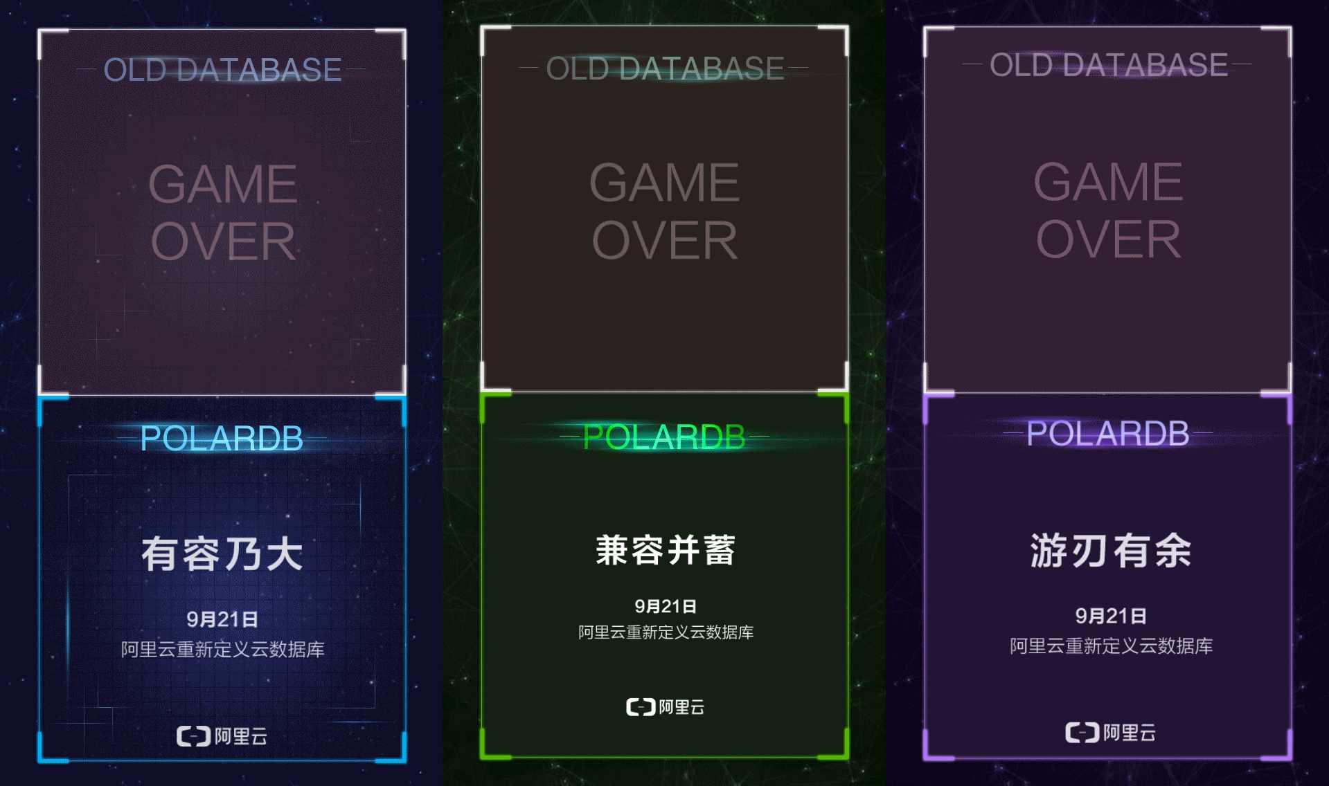 海报中,阿里云通过游戏动态对比展示了“OLD DATABASE”(旧时的数据库)与“POLARDB”(即将发布的全新一代云数据库)的体验差别,并以“有容乃大”、“兼容并蓄”和“游刃有余”来描述。笔者猜测,阿里云应该是想通过三张海报来表达POLARDB数据库在容量、性能、兼容性,甚至是扩展能力上的彻底革新。