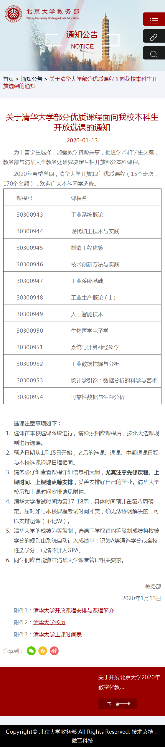 据北京大学教务部发布的《关于清华大学部分优质课程面向我校本科生开放选课的通知》,2020年春季学期,清华大学开放12门优质课程,共15个班次、170个名额,可供北大本科生选修;课程主要是理工科课程,既有传统的《工业系统概论》《现代加工技术与实践》《技术创新方法与实践》等,也不乏时下大热的《人工智能技术》《系统与计算神经科学》《工业数据挖掘与分析》等。