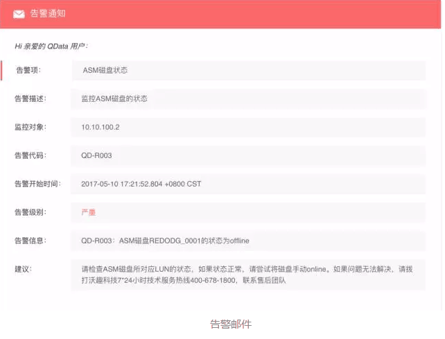 QData v5.0.0版本中,还提供了33个告警项,包括主机硬件(14)、操作系统(10)、QLink软件(4)、RAC集群(4)、IB交换机(1)。只要配置了这些告警项,一旦有故障或者问题发生,用户可以在第一时间收到告警邮件和短信,并且邮件中会提供智能化分析所得出的建议,帮助用户快速定位问题、消除故障。