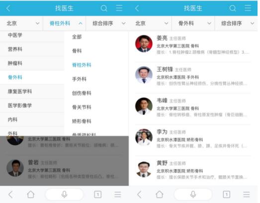 用户在前往某医院就诊之前,往往会搜索了解医生情况、出诊时间等基础信息,以便提升就诊效率。通过搜狗明医,用户只需点击频道首页的“找医生”标识,即可进入医生详情页面。比如如何找到北京各大医院的骨外科医生?选定地区、科室两个标签中的“北京地区”及“骨外科”,将自动筛选提供推荐医生名单,包括来自解放军总医院、北京大学第三医院、北京积水潭医院等多家三甲医院的骨外科专家和主任医师。此外,医生推荐名单还可根据距离远近排序,方便用户就近看病。