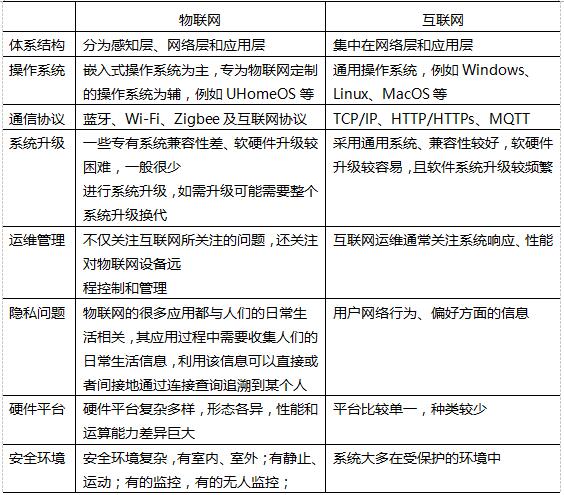 物联网是互联网的延伸,因此物联网的安全可以大力借鉴互联网安全,物联网和互联网的关系是密不可分。但是物联网和互联网在体系结构、操作系统、通信协议、系统升级、运维管理、隐私问题、硬件平台多样性、安全环境方面有大量的不同。物联网的安全既构建在互联网的安全上,也有因为其业务环境而具有自身的特点。总的来说,物联网安全和互联网安全的关系体现在:物联网安全不是全新的概念,物联网安全比互联网安全多了感知层,传统互联网的安全机制可以部分应用到物联网,物联网安全比互联网安全更复杂。物联网与互联网对比,见下表: