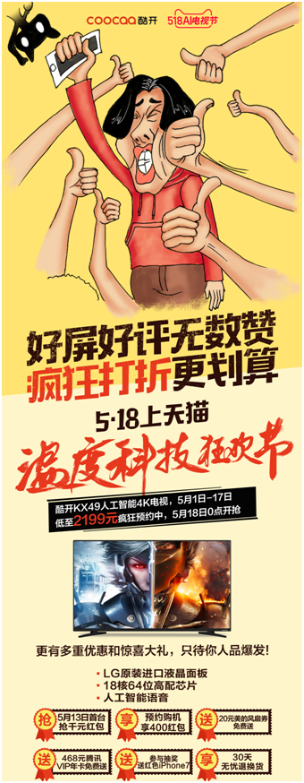 5月13日-17日预售正式引爆,5月18日0点上天猫,酷开KX49低至2199元,更享千元好礼,其他型号也正在火热促销中,不仅有400元红包立抢,最高立减1400元!除了现金红包、红色iphone7、腾讯VIP年卡等豪礼,炎炎夏日,酷开将贴心的为你送出美的风扇现金券;而作为以优质服务为宗旨的酷开,这次依旧秉承30天无忧退换货,让你在疯狂抢购的同时,接受最完善的服务保障!