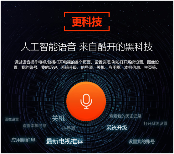 酷开KX49运用了人工智能语音技术和深度学习技术,充分发挥前沿科技在家庭娱乐生活中的作用,大幅提供智能电视的易用性,为更多的消费者提供更加务实的体验。通过酷开人工智能语音技术,可以更加轻松地打开系统的各个页面,例如系统设置、图像设置、我的账号、我的历史、系统升级、信号源、关机、应用圈、本机信息、主页等。